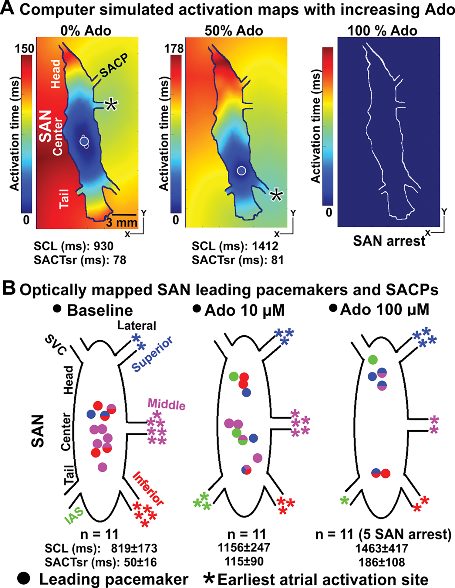 Importantly, increasing the concentration of adenosine from 0% to 100% in the computer models (Figs 2A and 3A) led to progressive slowing of the SCL and SACT in parallel with a shift in the leading pacemaker and earliest atrial activation sites, until complete atrial arrest at 100% adenosine concentration. The simulation results show that the leading pacemaker shifted inferiorly from the SAN center to the SAN tail, while the earliest RA activation site first shifted to the inferior lateral SACP for adenosine concentration 50% (Fig 3A) and then to superior lateral SACP at adenosine concentration 84% (Fig 2A).