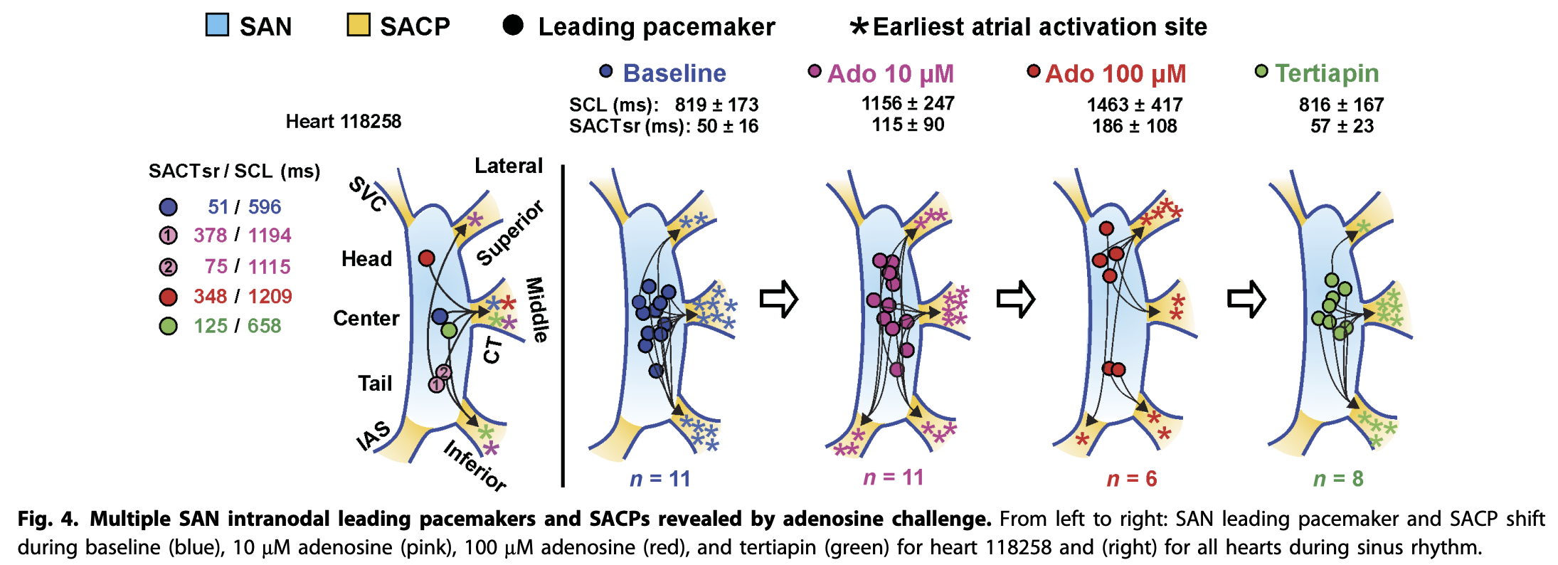 There are 5 sinoatrial conduction pathways (SACPs) connecting the sinoatrial node (SAN); 3 of them pop out towards the right atrial appendage/crista terminalis, and 2 of them on the side facing the SVC. Using optical mapping – where you use dyes that fluoresce in response to the transmembrane voltage difference22. See here for more details – Li, Hansen, and colleagues were able to demonstrate that administration of adenosine shifted the leading pacemakers from the center of the SAN to the head and tail (and, in contrast, tertiapin33. A 21-AA peptide from honeybee venom that blocks K