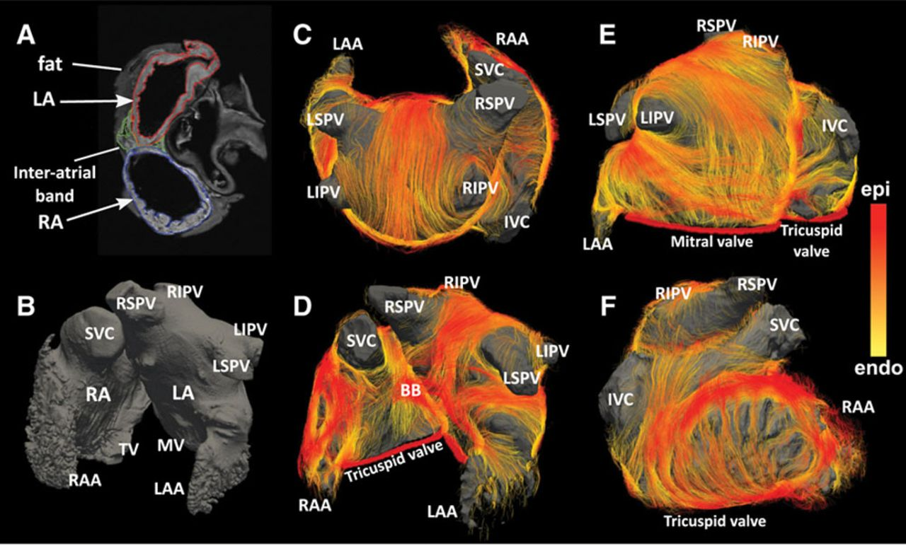 Well, while it is the case that these bundles do conduct impulses, the atria don’t have conduction tissue a la the His-Purkinje system. Instead, the conduction pathway from the SA to AV node occurs through anisotropic conduction along a network of myocyte bundles. Anisotropy here refers to the notion that this tissue is better at conducting impulses (here, electrical impulses) along a particular direction or axis (i.e. directionally dependent), rather than being particularly promiscuous and letting impulses run at equal speed any which way. For example, a 2016 study by Pashakhanloo et al used a very fancy custom 3D diffusion tensor MRI imaging sequence to identify a number of cardiac myocyte bundles that permit this anisotropic conduction at relatively88. Compared to general conduction through the myocardium. high speeds. Importantly, while the existence of these bundles was quite consistent, and e.g. Bachmann’s bundle was a consistent finding, it was not the case that there were only 3 major tracts connecting the SA and AV node: